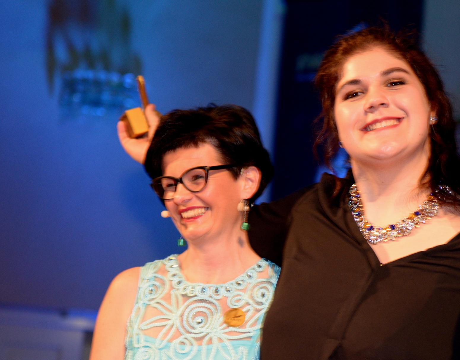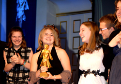 Janina Kürschner wird zur besten Hauptdarstellerin – Goldener Papageno – gekürt – Rolle: Lehrerin in Frau Koma kommt! von Valentin Werner, Regie: Gabriele Twardawa, AdRem Jugendtheater, Ludwigshafen.